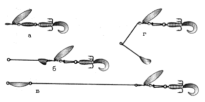 Кстати, застежку рекомендую делать удлиненную, чтобы лепесток не закрывал эффективную добавку. Рыба все-таки большей частью берет именно твистер и ей не должно ничто мешать. Изредка, когда необходимо провести блесну над самым дном, применяется “нижний груз” на проволочном коромысле (рис. 63 г).
