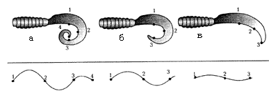 2. Чем толще хвост, тем медленнее и размашистее получаются колебания при проводке. А тонкий и мягкий “вьется” у самой оси, почти не разбрасываясь в стороны. Кстати, некоторые модели имеют не округлую, а более выраженную “угловатую” геометрию хвоста согласно точкам перегиба (рис. 65).