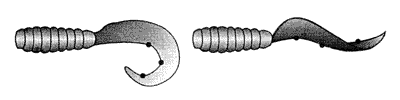 Форма хвостика — запятой, а конкретно — его конфигурация и толщина оказывают основное влияние на игру приманки. На рис. 64б изображен стандартный твистер, а рядом — его более и менее “загнутые” собратья. Чтобы примерно понять, как будет играть ваш твистер, положите его вогнутой частью на плоскую поверхность и аккуратно растяните. Выпрямившийся хвостик изогнется в виде некоторой волны.