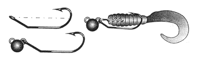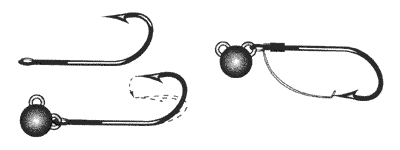1. Приманка. Сразу же следует отметить, что для свободной оснастки желателен виброхвост. Твистер же, как правило, непригоден. Это объясняется тем, что виброхвост имеет высокое тело и крючки гораздо проще расположить в его нижней части, чем внизу цилиндрического тела твистера. Правильно оснащенный виброхвост имеет центр тяжести ниже точки крепления и на свободной оснастке идет устойчиво. Твистер же оказывается неуравновешен, “заваливается” на бок, а из-за наличия вращающего момента обычно идет косо. Поэтому я и рекомендую для свободной оснастки только виброхвост. Единственной особенностью здесь является сквозное отверстие для внутреннего монтажа оснастки. Если такого отверстия нет, то его нужно проткнуть шилом или толстой иглой от переднего торца “рыбки” примерно до середины нижнего края.