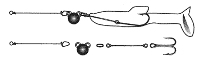 Свободная оснастка имеет два важных преимущества. Во-первых, она не создает при вываживании жесткого рычага, вырывающего крючок из пасти рыбы, а во-вторых, обеспечивает самую правильную и активную игру. При проводке играет не только хвост, но слегка колеблется также тело приманки, движение становится волнообразным и более похожим на естественное. Значит, поклевок будет больше, а сходов меньше. Вот почему именно свободная оснастка кажется мне оптимальной. Недостатком является лишь то, что она требует кое-что сделать своими руками и больше зацепляется.