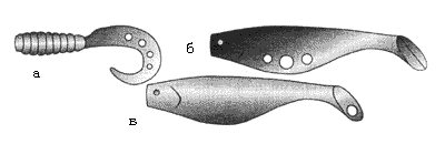 Достигается это применением натуральных добавок, таких как земляной червь, малек или кусочек рыбки (голова, филе, хвостик). На рис. 77 приведены варианты таких добавок, взятые из немецких и американских журналов. Добавление натуральности дает не только привычный вид пищи, но вероятно и какой-то запах. По крайней мере зарубежные рыболовы утверждают, что при плохом клеве смешанные приманки более эффективны, чем просто искусственные.