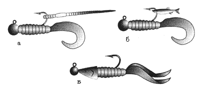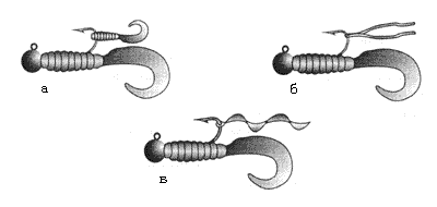 В России такие “новшества” не в моде, у нас вряд ли кто-то будет подсаживать на блесну или резину еще и червяка, поэтому привожу компромиссные варианты (рис. 78). Предложенный О.Соболевым дополнительный хвостик твистера другого цвета действительно частенько выручает. Вместо него можно просто привязать за крючок длинную нитку красного цвета или резиновую спиральную ленту.