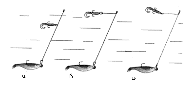 3. Возможность поимки сразу двух рыб. К недостаткам относятся повышенная зацепляемость, усложненность и применение оснасток, которые приходится делать самому. Так как частой добычей является щука, обе приманки должны иметь прочный поводок — и это обязательно! Не один раз я “прокалывался” на этом, почему-то считая, что крупную нижнюю приманку будет брать щука, а небольшую верхнюю — окунь, поэтому верхнюю сначала ставил на обычный поводок из лески. Несколько аккуратных срезов быстро убедили в том, как я заблуждался.