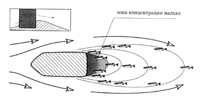 Схема облова такого участка зависит от наличия и направления ветра. В безветрие надо пускать лодку по границе основной струи и обратного течения (она как раз и находится над бровкой). Часто же дует боковой ветер, и удержать лодку на курсе не удается, ее несет под углом к течению. Тогда отмель приходится облавливать зигзагом, что может оказаться еще более результативным. Мною неоднократно замечено — на таких участках хищники стоят не только по бровкам, их можно встретить в любом месте подводной возвышенности, особенно интересны центральный скат и ближняя к быку зона.