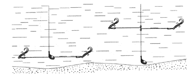Так как одним из основных объектов ловли является щука, то каждая из приманок должна обязательно иметь поводок. Из личной практики могу смело рекомендовать Г-образное “коромысло” размером 20х5 см из тонкой проволоки (я применяю струну гитары № 2). Возможно также расположение двух приманок не в вертикальной, а в горизонтальной плоскости (рис. 86). Здесь есть некоторая сложность: при заметно несимметричном расположении приманок леска начинает перекручиваться.