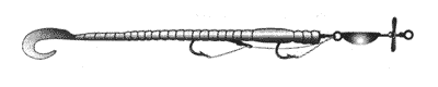Удачной приманкой является “длинный червь” (рис. 90). Удлиненная насадка уже своим размером привлекательна для щуки, поэтому и повышает уловы, несмотря на усложненную оснастку с двумя крючками — одинарниками. Для лучшего “звучания” и меньшего погружения “червяк” часто дополняется передним пропеллером.