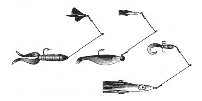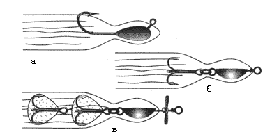В дальнейшем, когда вы научитесь проводить приманку в нужном горизонте интуитивно (по дальности заброса, наклону лески и т. п.), можно будет применять и более сложные оснастки с двойными или тройными крючками.