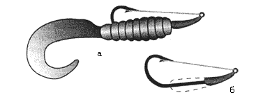 Наиболее простая оснастка — это легкая, хорошо обтекаемая незацепляющаяся джиг-головка с передним колечком (“банан”, “лыжа”, “ложка”), тогда она будет “проскакивать” траву, а не собирать ее. У меня, например, хорошо работала “лыжа”, у которой аккуратно кусачками и напильником убиралась задняя свинцовая часть, оставался лишь необходимый для заброса огрузок (рис. 96). Желательно оставить на крючке подобие фиксатора, чтобы приманка крепче держалась и не сползала с крючка. Можно использовать и твистер, и виброхвост, но в траве, особенно при слабом клеве, предпочтительнее твистер, он легче играет на самой медленной подмотке и при падении. Крючок защищается от зацепов так: из авиамодельной или бельевой резинки вяжется кольцо на ушке, и это кольцо натягивается на бородку (рис. 96,б). Поддев крючка загибается внутрь, чтобы жало находилось ниже резинки, под ее защитой.