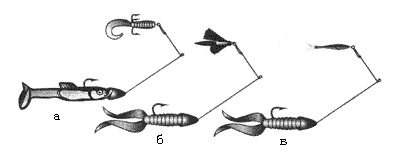Выбор приманок в значительной мере зависит от точности наших забросов. Если мы четко попадаем в метровую чистую зону, то можно брать приманки, перечисленные в предыдущей главе: прогонистые джиг-головки, головки с лепестком или спиннер-бэйт. Если же вас часто “заносит” в траву, то лучше выбрать другие, незацепляющиеся варианты (рис. и 34).