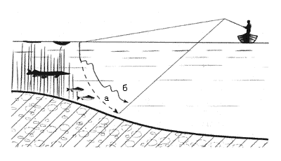 В таких случаях, если с лодки, поставленной недалеко, подбросить легкую приманку к самому краю водорослей и держать ее на натянутой леске, то она будет сравнительно медленно падать по дуге под самым носом щук и окуней. Такой способ, без проводки как таковой, а только со свободным падением, здесь может оказаться оптимальным. Во время падения полезно оживлять игру приманки коротенькими подергиваниями. Чтобы она находилась поближе к траве, можно забрасывать не перпендикулярно к краю водорослей, а под углом (рис. 106). Незацепляющуюся приманку можно “положить” и в самые заросли.