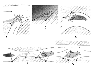 До и после гряды почва менее твердая, и в результате с обеих сторон переката образуются ямы и расширения с замедленным или обратным течением. Обычная схема переката изображена на рис. 112 (изредка встречается и другой тип, когда река на перекате, наоборот, расширяется, и течение там небольшое, но такие места для рыболовов менее привлекательны). Сам перекат, как правило, имеет свое русло — наиболее глубокую часть.