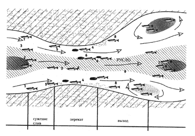 3. Как правило, хищник имеет свой маршрут на кормежку и обратно, который включает обход наиболее “кормных” мест. При этом охота будет удачной, если подкрасться к добыче незаметно: сзади, из глубины, против солнца и т. п. Отсюда ясно, что хищник может, выходя из ямы, курсировать “под бровкой”, маскируясь в ее тени — так легче подкрадываться к потенциальной жертве, самому оставаясь незамеченным. Значит, хищник, вероятно, предпочтет тот край ямы, где бровка более крутая и дает больше тени. Хотя бровка — бровкой, но этот фактор не обязателен. Главное, конечно, в другом — хищник идет на те места, где “пасется” мелочь (перекат, отмель, залив и т. п.). И даже если путь будет открытым, неудобным, все равно хищник пойдет именно туда — к потенциальной добыче: либо в обход, маскируясь; либо напрямую, броском или “загоном”.