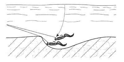 Похожая схема применяется и в реках с достаточно быстрым течением и имеющих выраженное русло и бровки. Так как большинство рыб придерживается подводных склонов, здесь могут использоваться два основных способа: