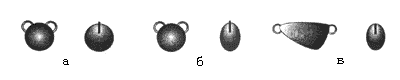 Основные виды джиг — головок представлены на рис. 10. В отличие от совмещенных вариантов, груз-головка может быть выполнена отдельно от крючка и шарнирно соединяться с оснасткой через заводное колечко или “петля в петлю”. Такая головка имеет два ушка для крепления к леске и к приманке. Отдельные груз-головки применяются в основном трех видов: “шар”, “чечевица” и “фильда” (рис. 11).