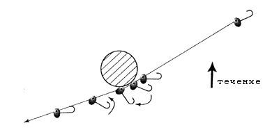 5. Важную роль играет незацепляемость приманки. Те модели, у которых при падении на дно крючок остается в вертикальном положении (“регби”, “раскачивающая”, “ложка”, “сапожок”, “подкова”, “Ванька-встанька” и др.), зацепляются гораздо реже остальных, особенно при ступенчатой донной проводке. Варианты, имеющие прогонистую (удлиненную) форму с колечком в носовой части (“лыжа”, “банан”, “ложка”), проще перескакивают различные препятствия. Чем больше боковые крылья у головки (“регби”, “подкова”), тем меньше вероятность бокового зацепа, особенно на течении (рис. 12). Некоторые модели имеют специальные предохранители от зацепов, о которых будет рассказано далее в отдельной главе.
