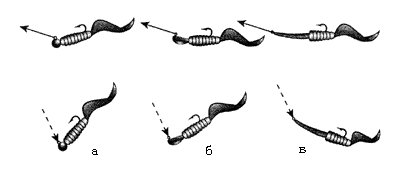 6. У большинства джиг-головок колечко для лески находится посередине груза, прямо над центром тяжести, т. е. отогнуто от цевья на прямой угол. Такие уравновешенные головки на леске висят горизонтально. Приманки с ними при подмотке идут вперед с некоторым наклоном, а при остановке быстро и почти отвесно падают вниз (рис. 13а). У головок с передним колечком при проводке крючок и приманка идут практически горизонтально, а вниз они опускаются уже медленнее и с большим отклонением. Причем головка “банан” упадет на переднюю часть, где у нее находится центр тяжести, а головка “лыжа”, наоборот, на заднюю (рис. 13б, в).