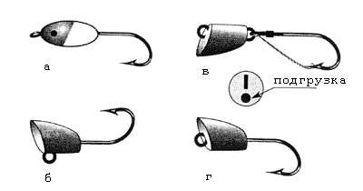 Сделать последние совсем несложно. Берется подходящий крючок, из пробки вырезается цилиндрик, в нижней части которого крепится свинцовая подгрузка. Чем тяжелее мы хотим сделать подгрузку, тем больше приходится брать пробку. Переднюю часть головки часто делают скошенной — это улучшает ее игру. Если острая кромка будет внизу (рис. 14в), то при потяжках такая головка будет нырять и, наоборот, острая кромка вверху (рис. 14 г) заставит приманку идти по самой поверхности “с волной”. А если в переднем торце сделать выемку, как у попперов, то наша головка будет еще и “булькать”.