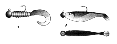 Твистер насаживается на джиг-головку, как правило, хвостиком вниз, хотя не исключен и обратный вариант. Крючок выводится в задней половине тела твистера, хвост остается свободным (рис. 15а). При насаживании риппера крючок выводится в спинку “рыбки” там, где она начинает сужаться к хвосту (рис. 156), чтобы не ухудшать игру. Ведь ясно, что колеблется только та часть приманки, которая находится сзади, сам же крючок и передняя часть неподвижны. При необходимости насадка на джиг-головке легко и быстро заменяется на другую.