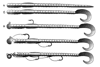 Приманки в виде длинных червей (рис. 23) довольно широко применяются за границей. Из-за большой длины они более заметны и “аппетитны”. Оказалось, что «наши» хищники тоже неравнодушны к таким червям, особенно щука и судак. Длинные приманки могут стать эффективнее обычных во время вялого клева хищника, когда последний играет с добычей, как кошка с мышкой. Нo “длинные черви” требуют довольно сложной оснастки несколькими крючками.