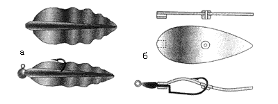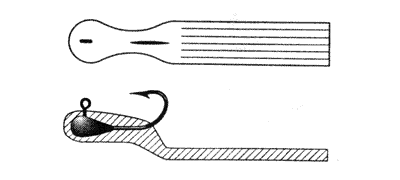 Новая интересная конструкция (рис. 25), напоминающая лист дерева, имитирует пиявку или ската. Края “листка” тонкие, мягкие и слегка волнистые, при движении трепещут, струятся, колышутся. Другая разновидность “листка” имеет наплывы для крепления на специальный крючок и придания приманке вида латинской буквы “S” для возбуждения колебаний (рис. 256).