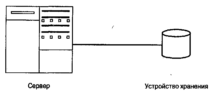 Технология Fibre Channel поддерживает подключение по топологии «точка-точка». В этом случае сервер обычно подключается к выделенной подсистеме хранения, причем данные не используются совместно. На рис. 4.1 показана сеть, построенная на основе этой топологии.