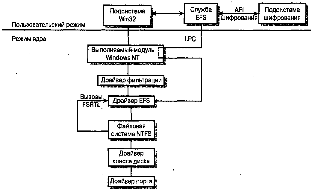 Служба EFS обеспечивает работоспособность функций шифрации/де- шифрации и генерацию шифрованных ключей с помощью инфраструктуры API шифрования, входящей в Windows NT. Служба EFS взаимодействует с драйвером EFS с помощью локальных вызовов процедур (LPC), предоставляемых операционной системой.