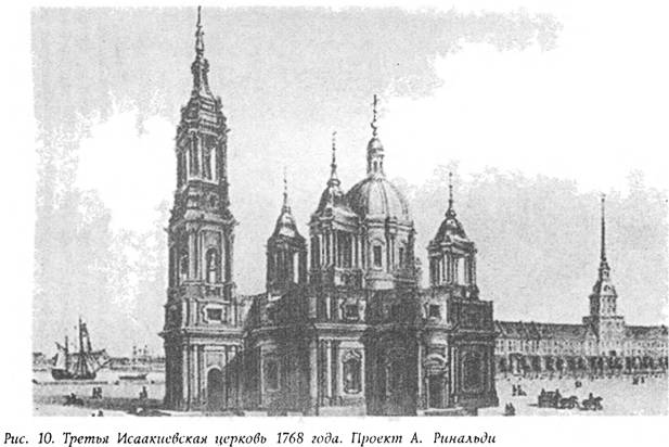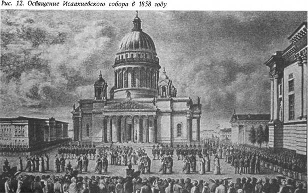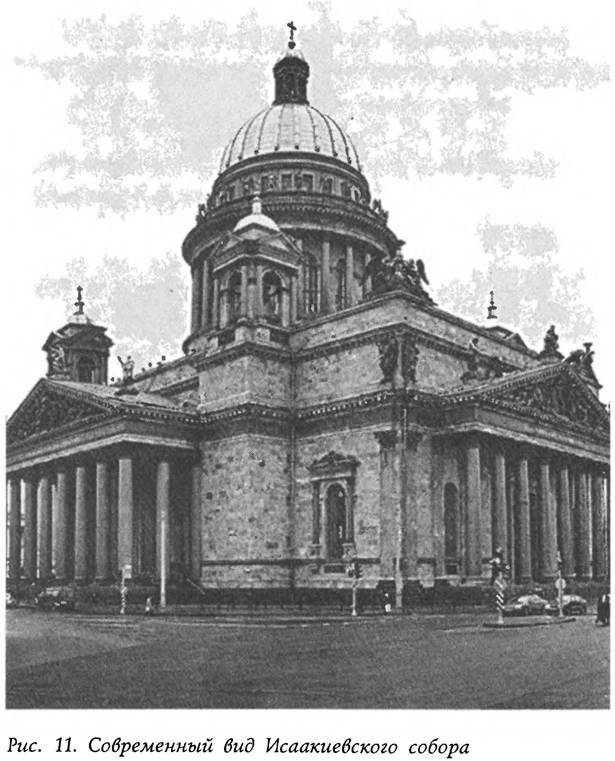 Известно, что на протяжении полутора веков, начиная с Петра I и кончая Николаем I, Романовы, не жалея сил и средств, целеустремленно возводили в Санкт-Петербурге огромный Исаакиевский собор. Точнее, соборов с таким именем было несколько, рис. 9, 10. Один сменял другой, еще более грандиозный, пока, наконец, в 1858 году не была закончена постройка нынешнего гигантского Исаакиевского собора, рис. 11. Он был отделан с крайней пышностью. Средств явно не жалели. И не только средств, но и людей.
