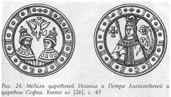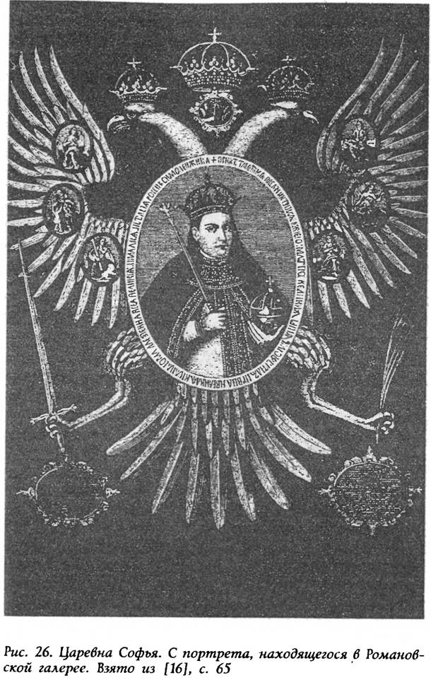 У власти два 6рата — мальчика Иван и Петр, рис. 24, 25. Фактически правит их старшая сестра Софья, рис. 26. Молодые цари отстранены от дел. Один из них — Петр, попадает под влияние иностранцев. Они приучают его к попойкам и разгульному образу жизни. Все его начинания кончаются неудачами и пустой тратой денег. В 1696 году царь Иван умирает, оставив после себя только дочерей. Окружение Петра немедленно оценило ситуацию. Уже в марте 1697 года молодого царя, находившегося под полным влиянием своих учителей — иностранцев (и, вероятно, уже алкоголика) увозят за границу. Там его подменяют на другого человека. Появляется самозванец. По-видимому, в заговоре непосредственно участвует польский король Август, поскольку именно в Польшу из Москвы вскоре отправят ПОЛТОРА МИЛЛИОНА РУБЛЕЙ СУБСИДИЙ (то есть, надо полагать «безвозмездной помощи»). Что, ни много ни мало, составляло годовые ПОСТУПЛЕНИЯ В КАЗНУ СО BCEГO MOCKOBCKOГO ГOCУДAPCTBA тех времен.