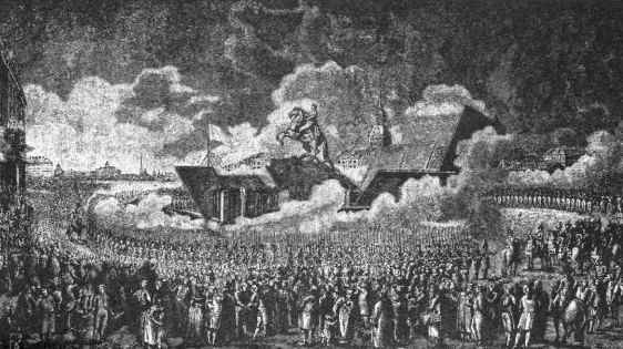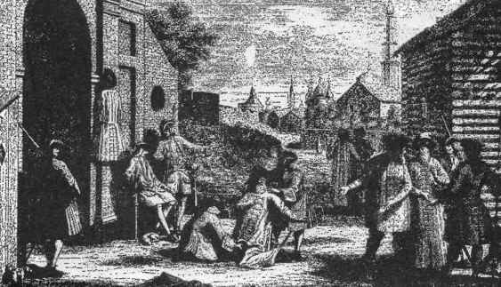 Рис. 27. Укорачивание русских кафтанов на заставе. С голландской гравюры И. Филипса начала XVIII века.