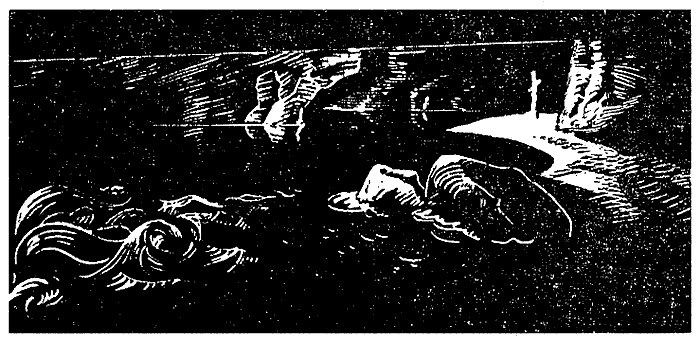 Я сказал уже: лодка почти все время плыла над водой. Были только два случая, когда понадобилось погружение: при выходе из озера Далеких Надежд, и — самое опасное — где-то ниже этого озера, когда мы огибали Шумящую Стремнину. Здесь нам пришлось, минуя скалистый порог, уйти минут на двадцать пять почти на двадцать два метра в глубину. В отсеки «Зеты» тотчас стала просачиваться вода, но мы теперь были уже близки к цели.