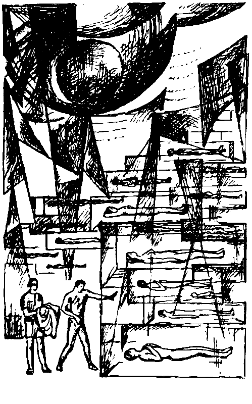 Срезанную вершину опрокинутого конуса они прошли за несколько минут. Лиловая стена распахнулась, как при входе,и опять руки нащупали только воздух. А зрелище, открывшееся им,в точности повторило только что виденное.То же множество бронзовых тел в стекловидных кабинах, убегающих ввысь опрокинутой половиной конуса, лиловое солнце над головой и тающая сумеречность исчезающих перегородок.