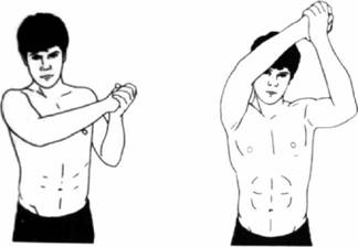 Левая рука опущена вниз, вдоль туловища Правой возьмитесь за запястье (или чуть выше) левой руки и поднимайте левую руку вверх, отводя в сторону и сгибав в локте. Противодействия, создаваемого правой рукой (тяните вниз) должно хватить для выполнения 8-12 подниманий.