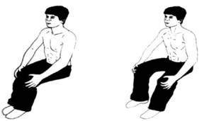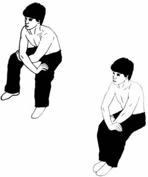 Сядьте на табурет, ноги расставлены в стороны. Упритесь руками с внутренних боковых сторон коленей.