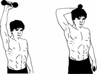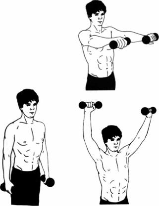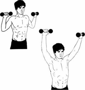 Стоя. Руки согнуты в локтях, гантели на уровне головы. Поднимание гантелей над головой.