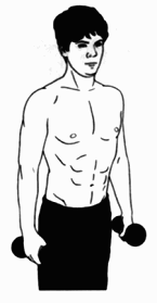 Стоя. Руки опущены вниз. Поднимание гантелей к подбородку.