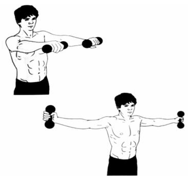 Стоя. Руки с гантелями опущены вниз. Поднимите руки параллельно полу, затем разведите в стороны. Опустите руки.