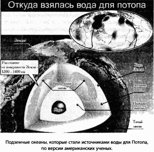 Конечно, все сказанное выше — всего лишь гипотеза, имеющая свои pro и contra, однако, надо отметить, гипотеза, подтвержденная не только словами Библии, но и данными современной науки. В феврале 2007 года американские ученые Майкл Вайсешн, профессор сейсмологии Вашингтонского университета (Сент-Луис) и Джесси Лоуренс из Калифорнийского университета (Сан-Диего) сообщили об открытии, по крайней мере, двух подземных океанов, один из которых располагается под Восточной частью Евразии, а другой — под Северной Америкой на глубине от 1200 до 1400 км. По запасам воды эти океаны не уступают Ледовитому. Именно такие водные резервуары и могли быть библейскими «безднами вод». Ученые даже смоделировали, как мог происходить всемирный потоп: «Не исключено, что в допотопные времена подземные резервуары основательно прорвало. И началось катастрофическое извержение горячей соленой воды с паром, как из лопнувшего котла. Уровень Мирового океана поднялся, а сверху от сконденсированного пара еще и ливень хлынул — на 40 дней и 40 ночей. Вот и получился Всемирный потоп. А потом воду засосало обратно внутрь»{33}.