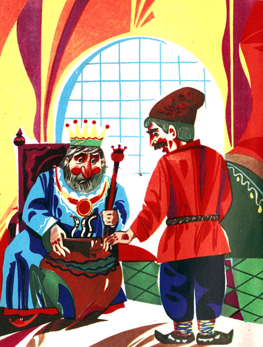«Неужели правда, что этой мерой они золото мерили», — думает царь. Встряхивает меру, — звеня, выпадает золотой.