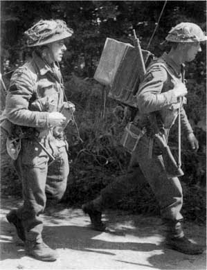 Рядовой (справа), несущий радиостанцию № 18, вероятно, входит в состав штаба роты. Над его правой манжетой хорошо видны четыре красных шеврона на подложке цвета хаки — по одному за год службы, согласно положению, утвержденному в феврале 1944 г. (иногда можно встретить утверждения, будто такие шевроны на фронте не носили). Фотографии солдат британской 2-й армии в Северо-Западной Европе показывают огромное разнообразие в использовании нарукавных знаков различия. Их могли вообще не нашивать, или носить ленты с названием полка, дивизионные эмблемы, одну или несколько нашивок с приборным цветом рода войск или служб; иногда эти знаки дополнялись неуставными эмблемами отдельных подразделений. Оба солдата на этой фотографии имеют полные комплекты нашивок — вверху эмблема 15-й дивизии, ниже — две красных (пехотных) полоски по старшинству бригады, еще ниже — батальонный ромб тартана «Черная стража», наконец, шевроны за выслугу лет (некоторые из этих нашивок довольно обтрепаны).