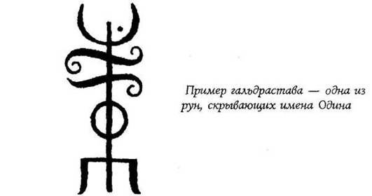 Гальдрастав — термин, происходящий, как уже упоминалось, от исл. galdor «магия» и stafr «знак», — означает сложный магический символ, который может быть нанесен как на специально для того изготовленный амулет, так и на произвольный предмет. Здесь нас интересуют только рунические гальдраставы, в историческом отношении представляющие собой, вероятно, дальнейшее развитие искусства составления вязаных рун. Классическим примером гальдрастава может послужить известная Руна Одина, представляющая собой одно из его имен — Тунд (исл. Thundur, «Распятый» или «Обладающий Громом»).