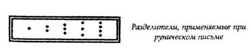 Нужно отметить и отсутствие пробелов в руническом письме. В большинстве случаев вся надпись выполняется слитно, без разбивки на слова. В некоторых случаях отдельные предложения или смысловые части надписи при необходимости разделяются специальными знаками, представляющими собой одну или несколько точек.