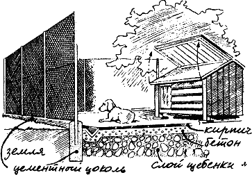 Вольера, в которой собака должна иметь свободу передвижения, изготавливается из туго натянутой проволочной сетки, нижняя часть которой должна быть закреплена под землей на такой глубине, чтобы собака не смогла подрыть ее. Одновременно сетка должна быть достаточно высокой, чтобы собака не смогла ее перепрыгнуть. Пол вольеры с легким наклоном (для стока воды!) целесообразно делать из бетона. Если поверхность площадки земляная, рекомендуется покрыть ее толстым слоем песка.