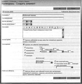 17. Щелкните на ссылке Создать (New) на панели инструментов, чтобы открыть страницу Календарь: Создать элемент (Calendar: New Item).