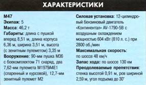 Башня и корпус М47 были сварными. В передней части броневого корпуса размещались механик-водитель и стрелок из курсового пулемета, во вращающейся на 360° башне - три члена экипажа (командир, наводчик и заряжающий), в корме танка - моторно-трансмисси- онное отделение. Основное вооружение включало 90-мм пушку (углы возвышения от - 5° до +15°), дополнительное - 7,62-мм спаренный пулемет (слева от пушки) и курсовой такого же калибра в передней правой части корпуса.