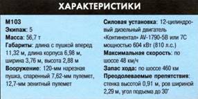 По своей компоновке и форме М103 являлся увеличенной копией М48. В башне размещались четыре члена экипажа - командир по центру сзади (он имел башенку с установленным на ней 12,7-мм зенитным пулеметом М2НВ), слева от казенной части орудия находился заряжающий, справа - наводчик и еще один заряжающий. Ходовая часть включала торсионную подвеску, по бортам были установлены по семь опорных сдвоенных об- резиненных катков, шесть поддерживающих роликов, ведущее колесо сзади и направляющее впереди. Основное вооружение включало 120-мм нарезную пушку с углами наведения по вертикали от -8° до +15°, установленную во вращающейся на 360° башне.