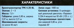 Компоновка ТРК 4.20 BL аналогична компоновке грузового автомобиля - двигатель расположен впереди, командир и механик-водитель - посередине, десант - сзади. Рабочие места водителя и командира оснащены лобовыми стеклами (с броневой крышкой), боковой дверью с пуленепробиваемым стеклом в верхней части и люком над сиденьем. Десант размещается на скамейках вдоль бортов машины, доступ в отделение осуществляется через две кормовые двери. По бортам и в кормовой части могут оборудоваться бойницы и стеклоблоки, а на крыше десантного отделения устанавливаться башня с 7,62- или 12,7-мм пулеметом. Один из вариантов машины имеет десантное отделение без крыши и с откидывающимися бортами.