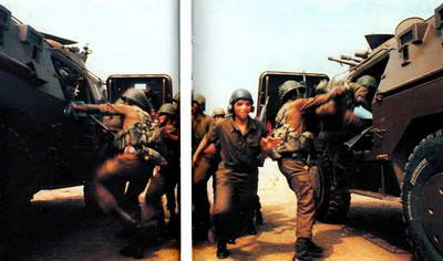 Посадка южноафриканских пехотинцев в боевые машины пехоты «Ратель». Машина с колесной формулой 6x6 была разработана фирмой «Сэндок-Аустрал» и отвечает таким требованиям, как высокая проходимость, запас хода 1000 км и высокая надежность в любых условиях эксплуатации.