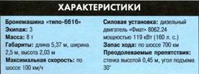 Кроме того, 15 машин были проданы Перу и 30 - Сомали. Производство «типо-6616» завершено. Корпус «типо-6616» сварен из стальных листов толщиной 8 мм, что несколько меньше аналогичных показателей других машин этого же класса. Водитель располагается в носовой части машины слева. Пуленепробиваемые стеклоблоки обеспечивают ему хороший обзор впереди и по бокам. Двухместная башня находится в центре, а мотор- но-трансмиссионное отделение - в кормовой части. Водные преграды «типо-6616» преодолевает на плаву со скоростью до 5 км/ч за счет вращающихся колес. Перед спуском на воду необходимо включить откачивающие насосы и провести герметизацию уходящих под воду узлов. В башне располагаются командир (слева) и наводчик (справа). Их места оборудованы регулируемыми сиденьями, приборами наблюдения и люками.
