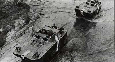 Советские БРДМ-1 с колесной формулой 4x4 после форсирования водной преграды. Движение на плаву со скоростью до 9 км/ч обеспечивалось за счет водомета, установленного в корме корпуса. Для преодоления препятствий на пересеченной местности использовались дополнительные колеса, размещенные по бортам между передним и задним мостами.